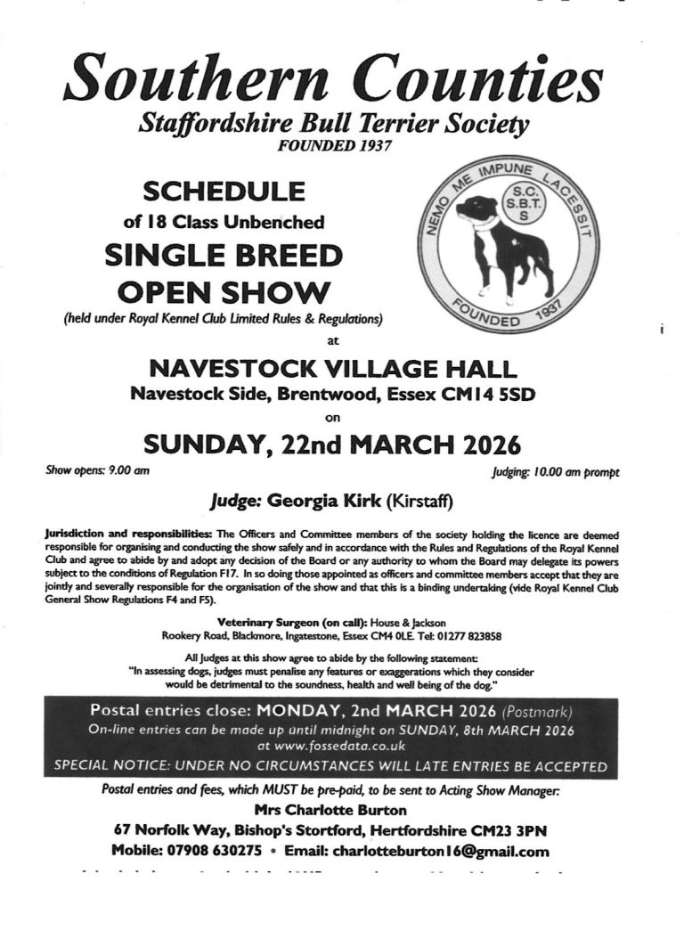 Welcome to the Southern Counties Staffordshire Bull Terrier Society Website